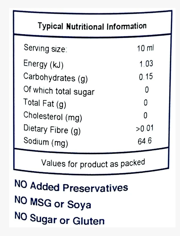 Ingredients: Purified Water, Balsamic Vinegar, Himalayan Crystal Rock Salt, Xanthan Gum, Flavouring, Xanthan Gum, Caramel